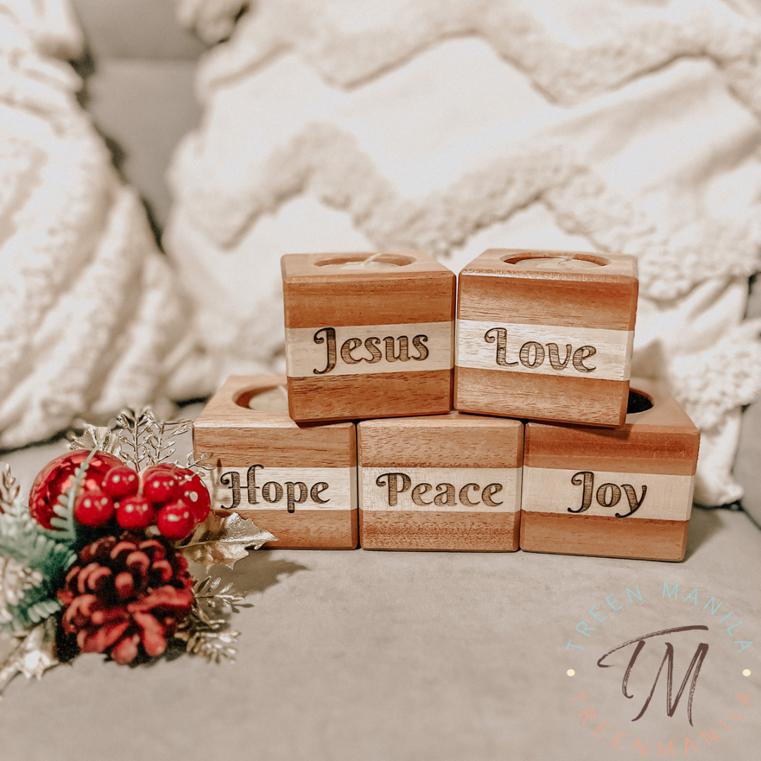 This is a different kind of advent wreath in a set of Two Tone Wooden tealight blocks with engraving on natural wood. Made of local Mahogany and Gmelina wood. It can be displayed in your home even if it's not Christmas or Lenten season. It's a wonderful reminder of who and what Jesus is for all of us.