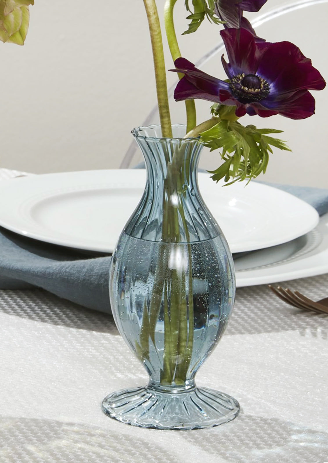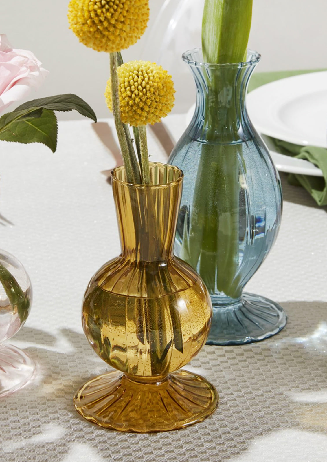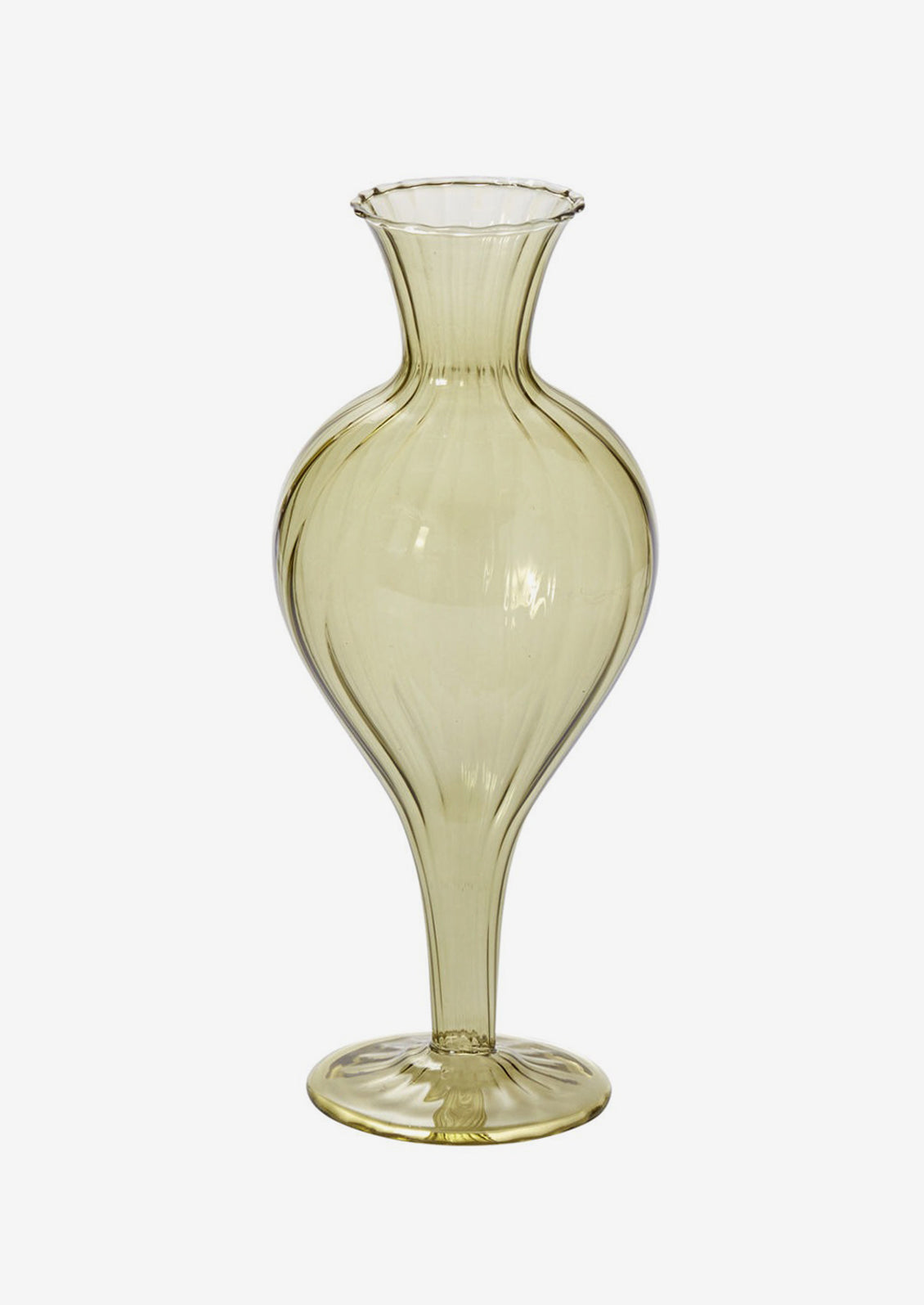 Showing off a fluted pattern in tinted glass, this shapely vase shows off a playful, curved silhouette — choose from warm amber, earthy olive or stormy blue.