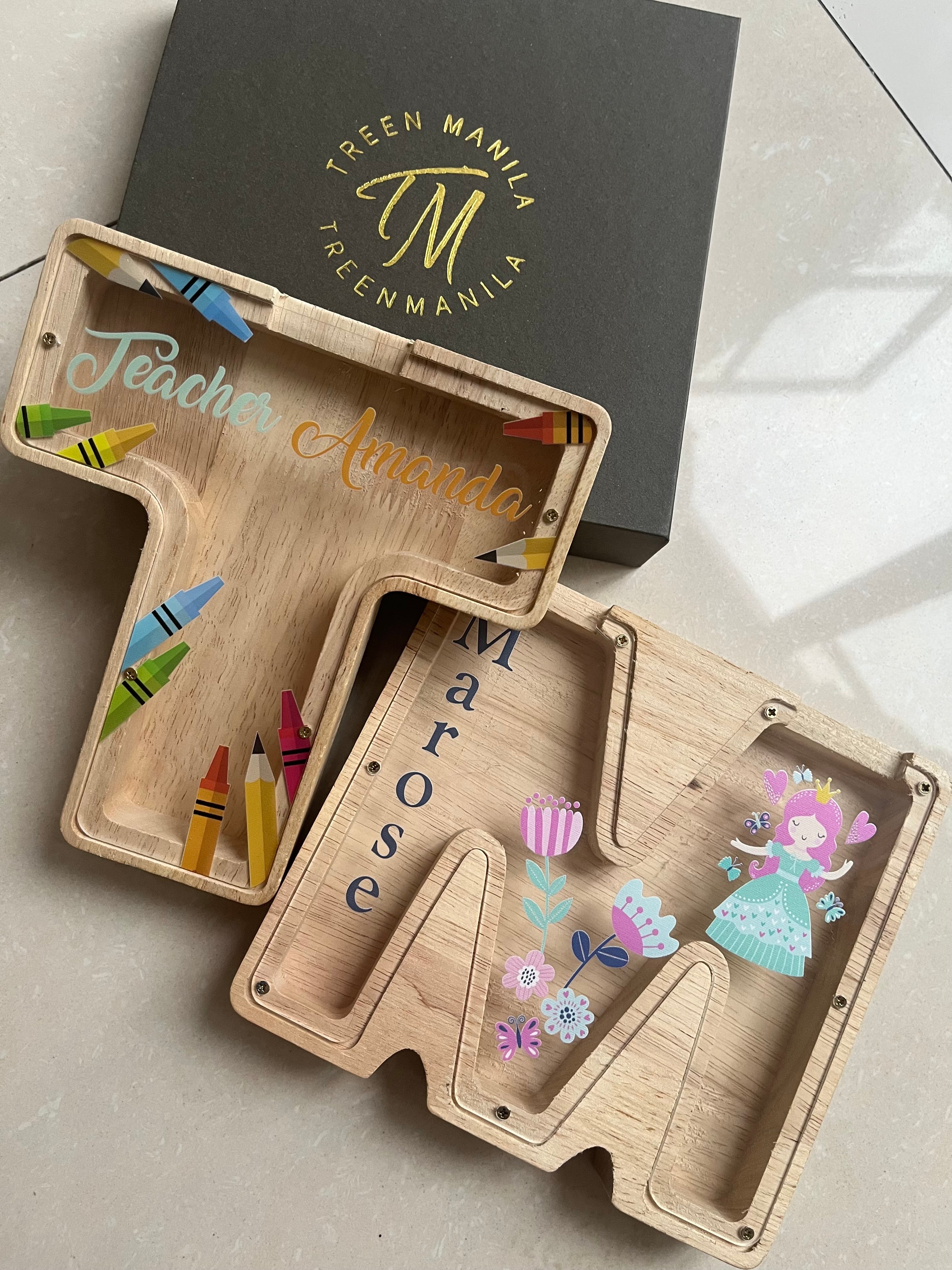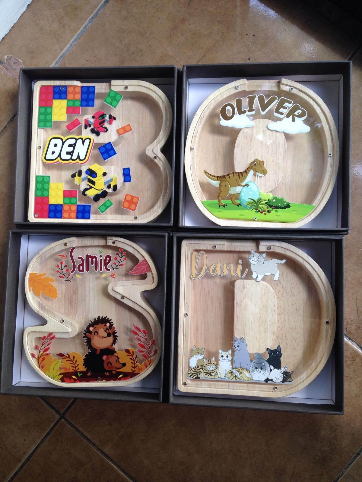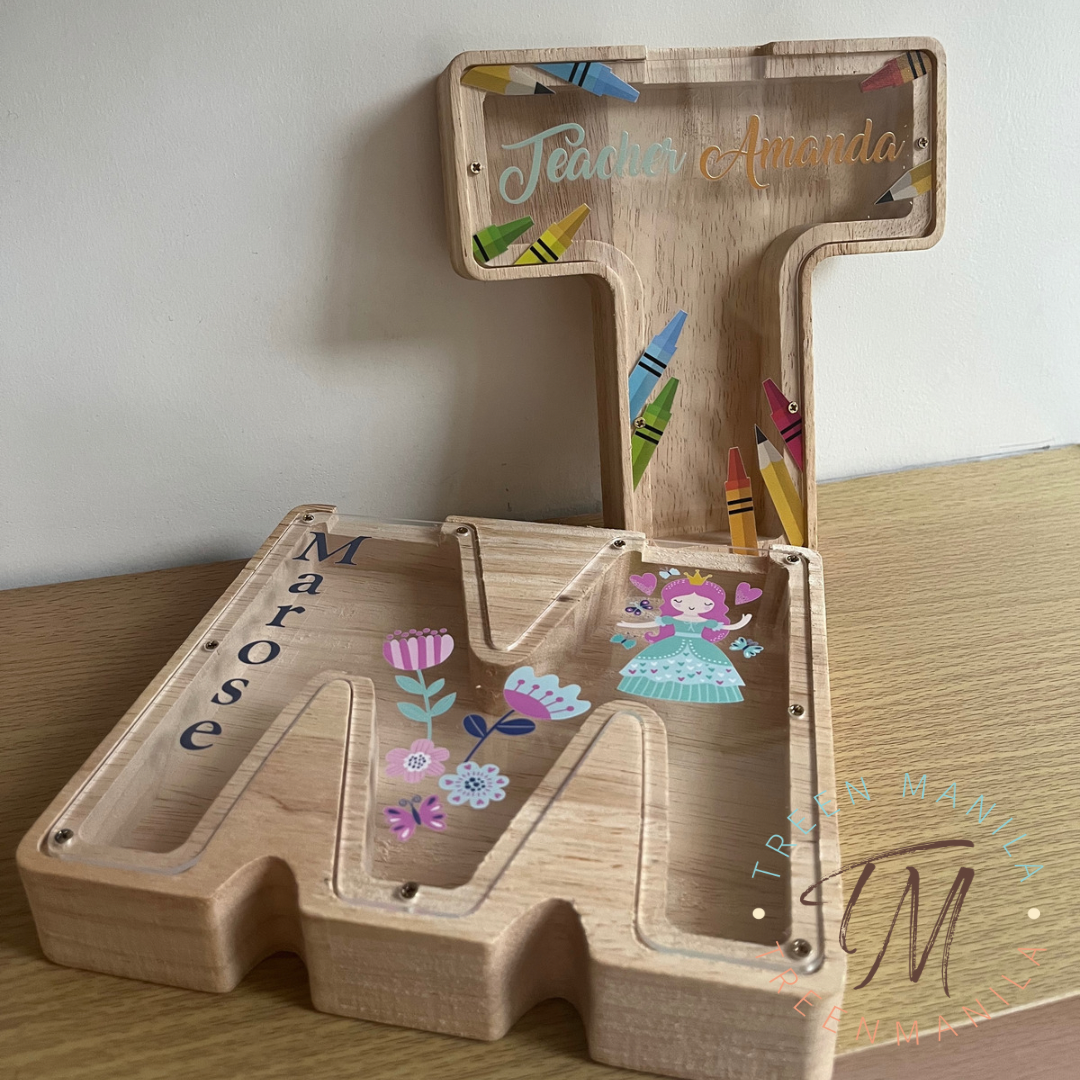 Our wooden letter coin bank makes a perfect gift to anyone, kids or adults for any occasion. The size is 7.5 inches in height (width varies per letter) with thickness of almost 2 inches. It is made of reclaimed pinewood, hence please manage expectation with the finishing) and clear acrylic with screws.